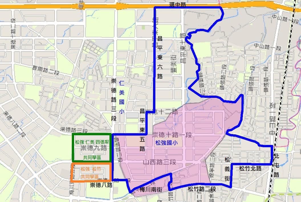 - 仁和里【7鄰(崇德路三段以西、崇德八路以北)、18鄰(崇德八路以北)、27鄰、31鄰(崇德八路以北)】為松竹國小、松強國小共同學區。